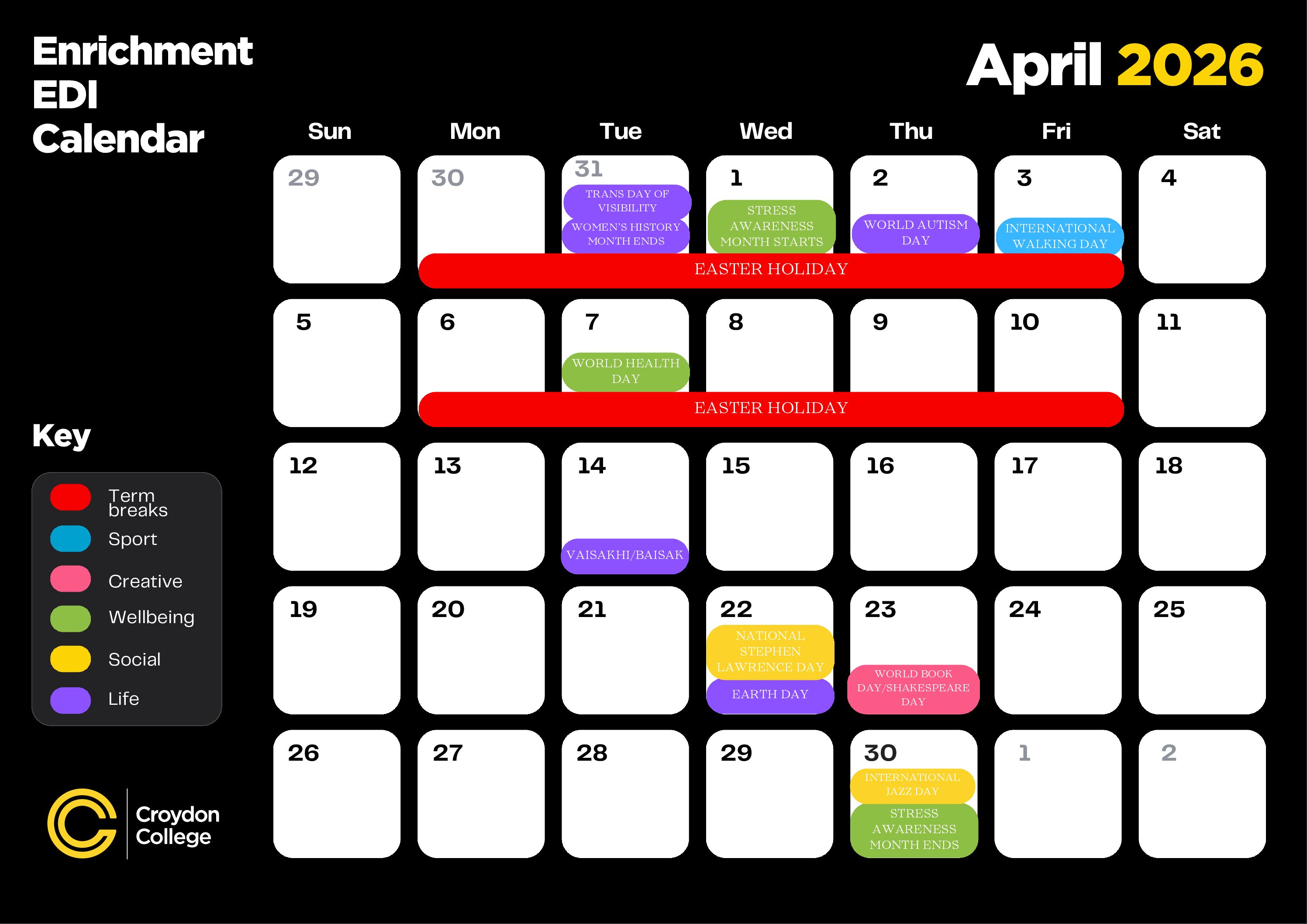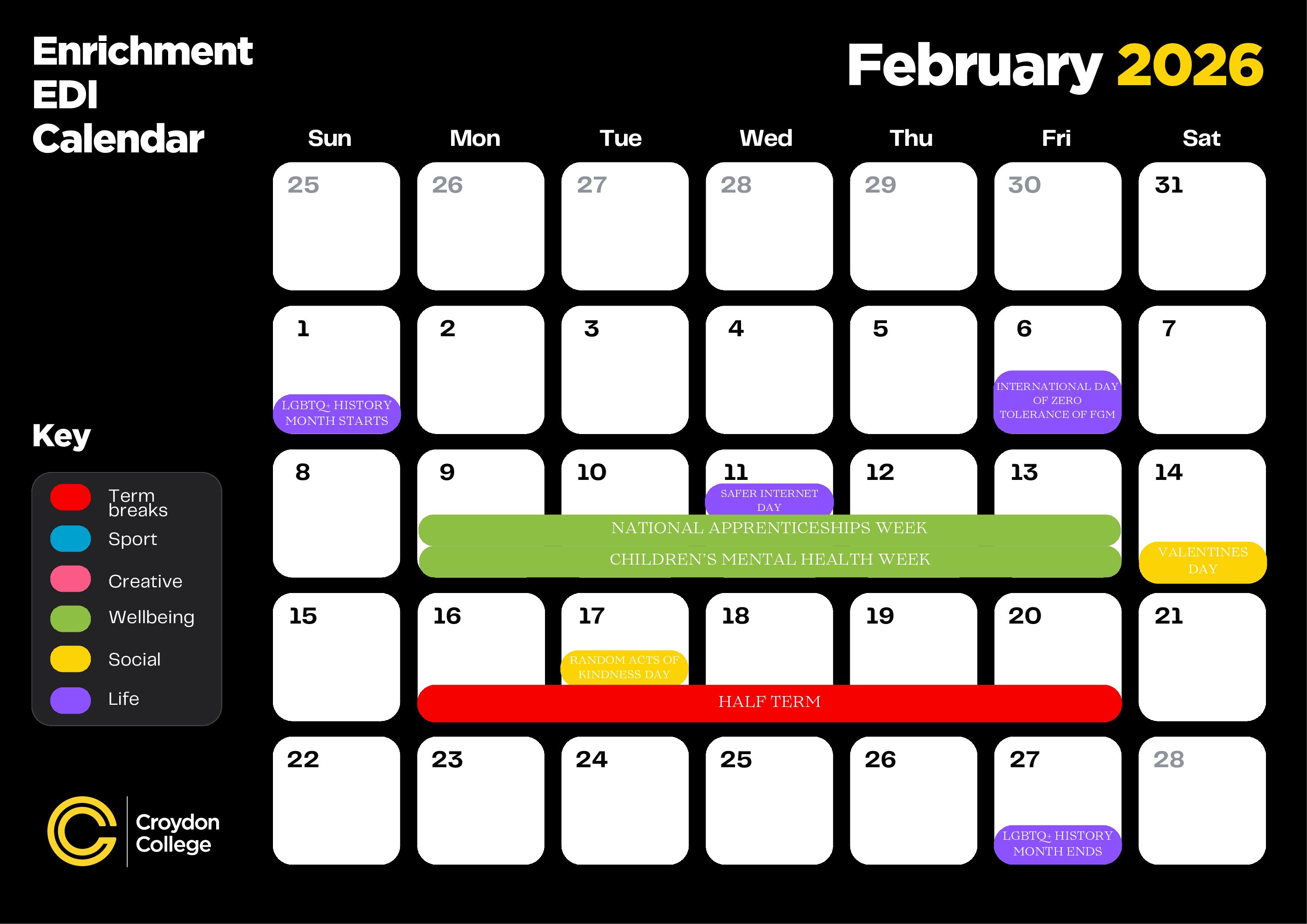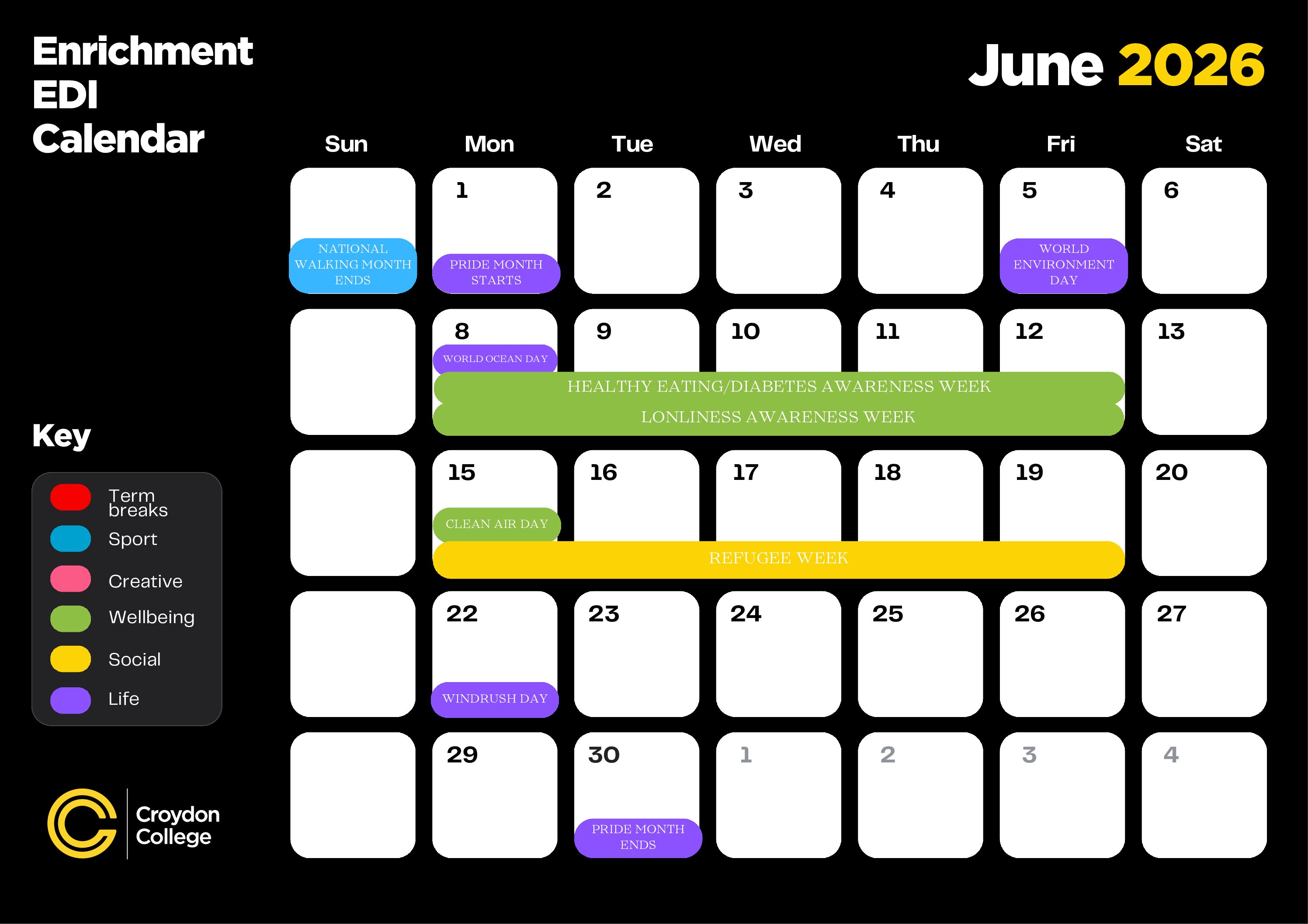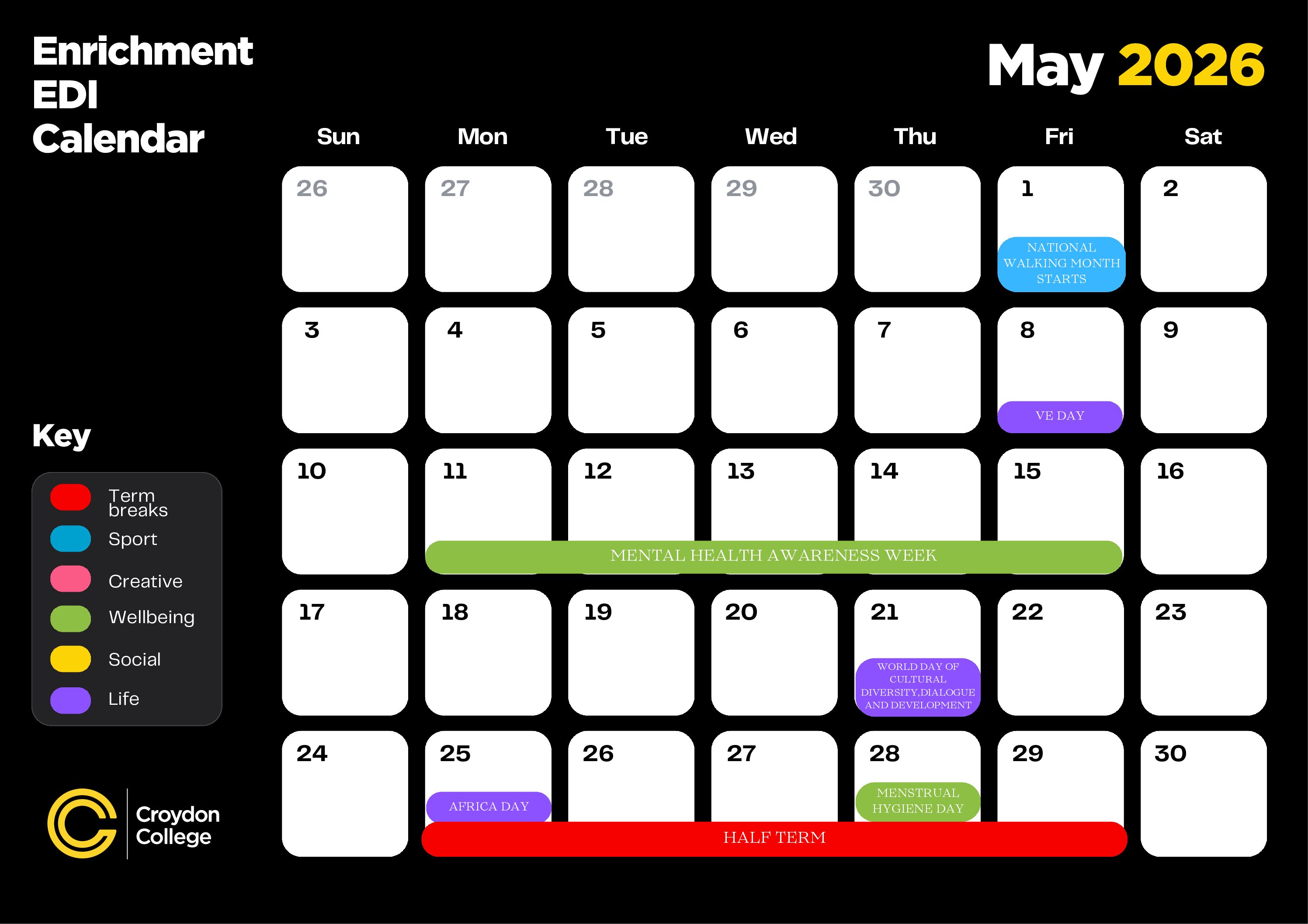 We believe that our diversity is one of our greatest strengths. We proudly welcome adults of all ages, abilities, religions, and sexual orientations, and are committed to providing everyone with access to high-quality education. As part of our ongoing journey toward greater equality, diversity, and inclusion (EDI), we’ve created this calendar to highlight important events and foster a culture where everyone feels included. We hope this resource proves valuable,