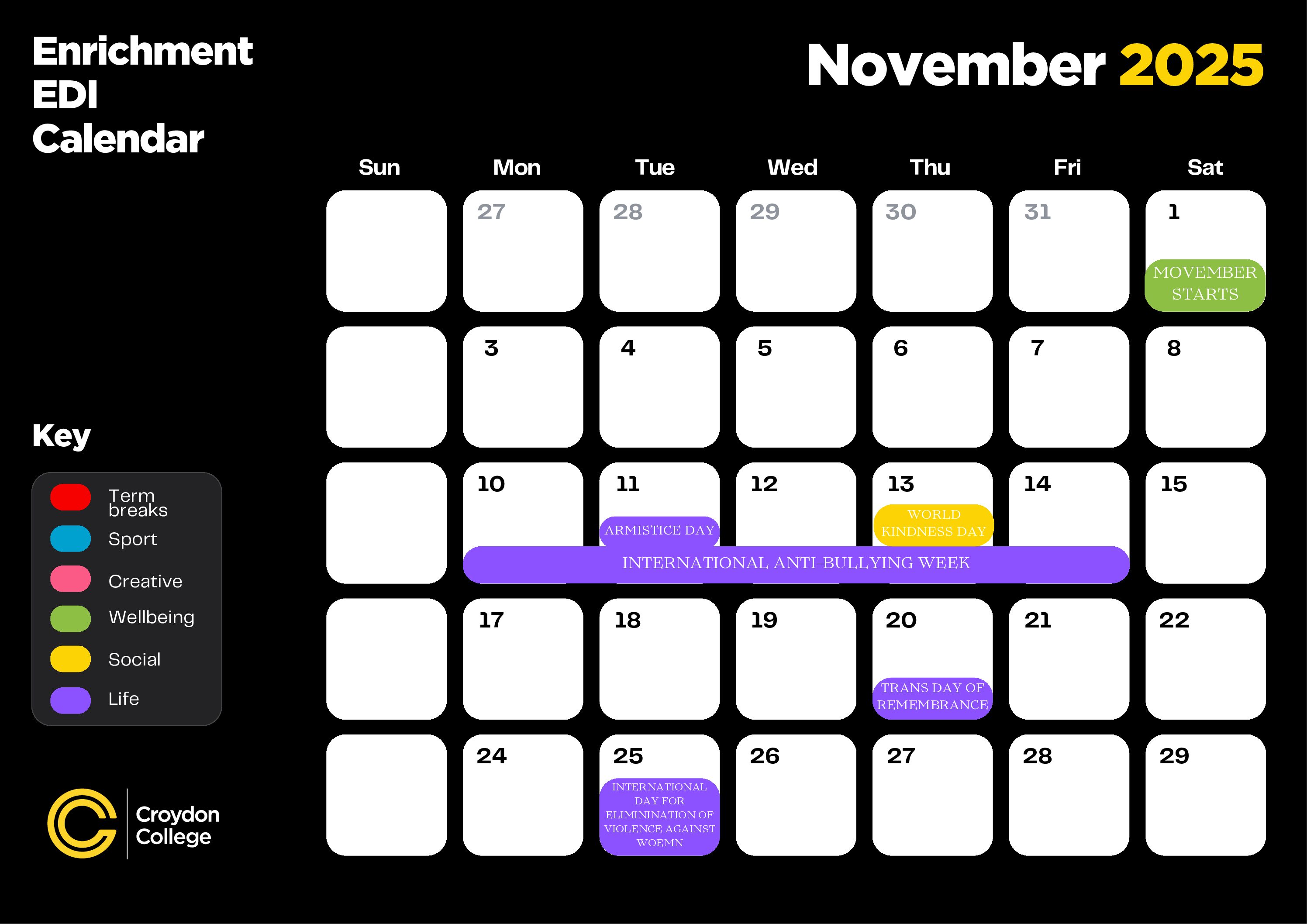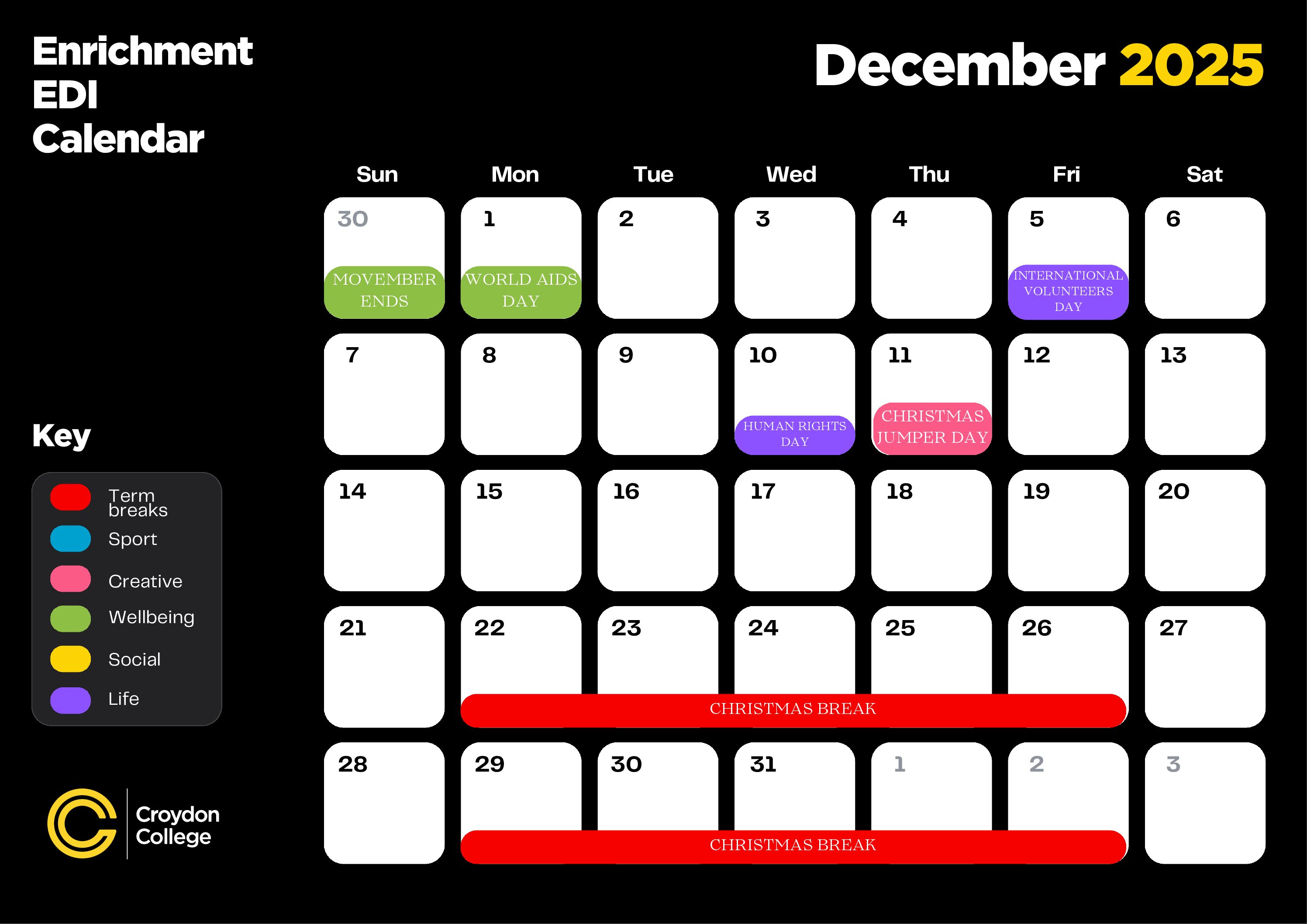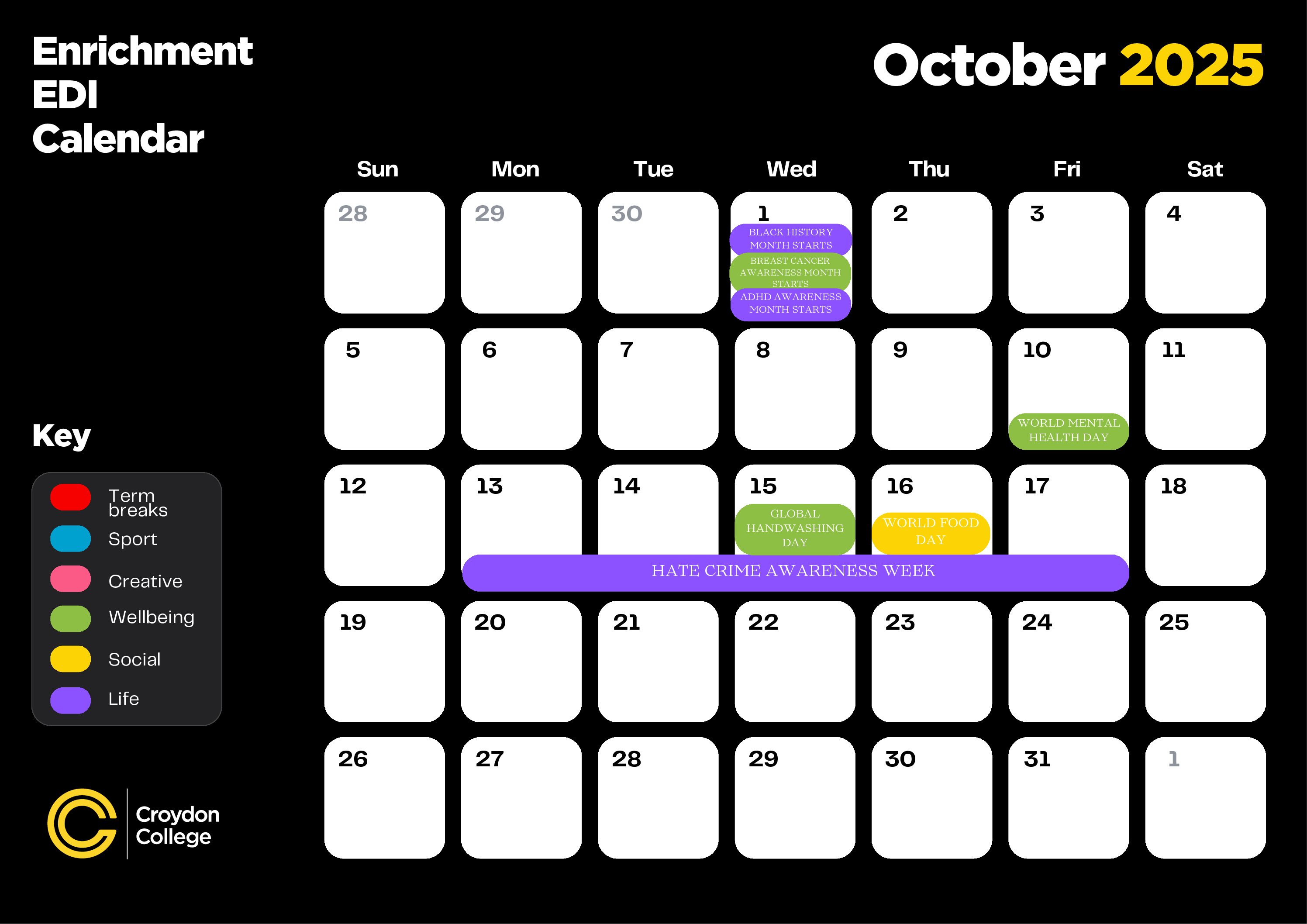 We believe that our diversity is one of our greatest strengths. We proudly welcome adults of all ages, abilities, religions, and sexual orientations, and are committed to providing everyone with access to high-quality education. As part of our ongoing journey toward greater equality, diversity, and inclusion (EDI), we’ve created this calendar to highlight important events and foster a culture where everyone feels included. We hope this resource proves valuable,