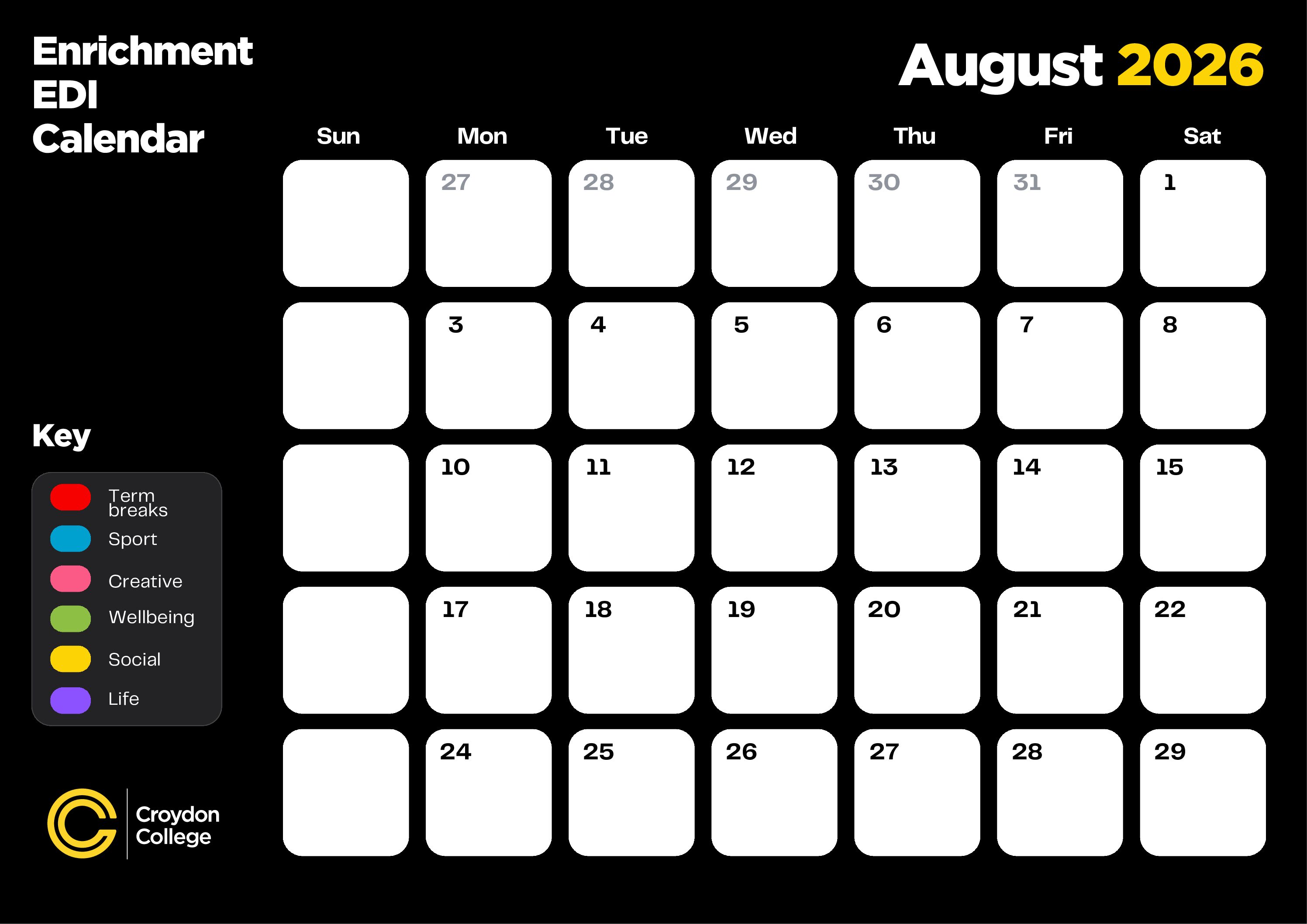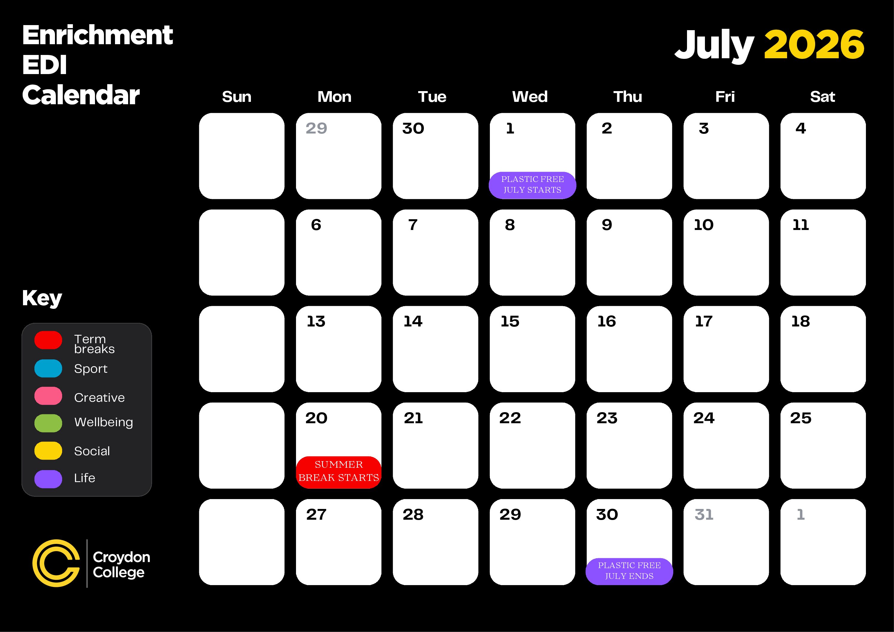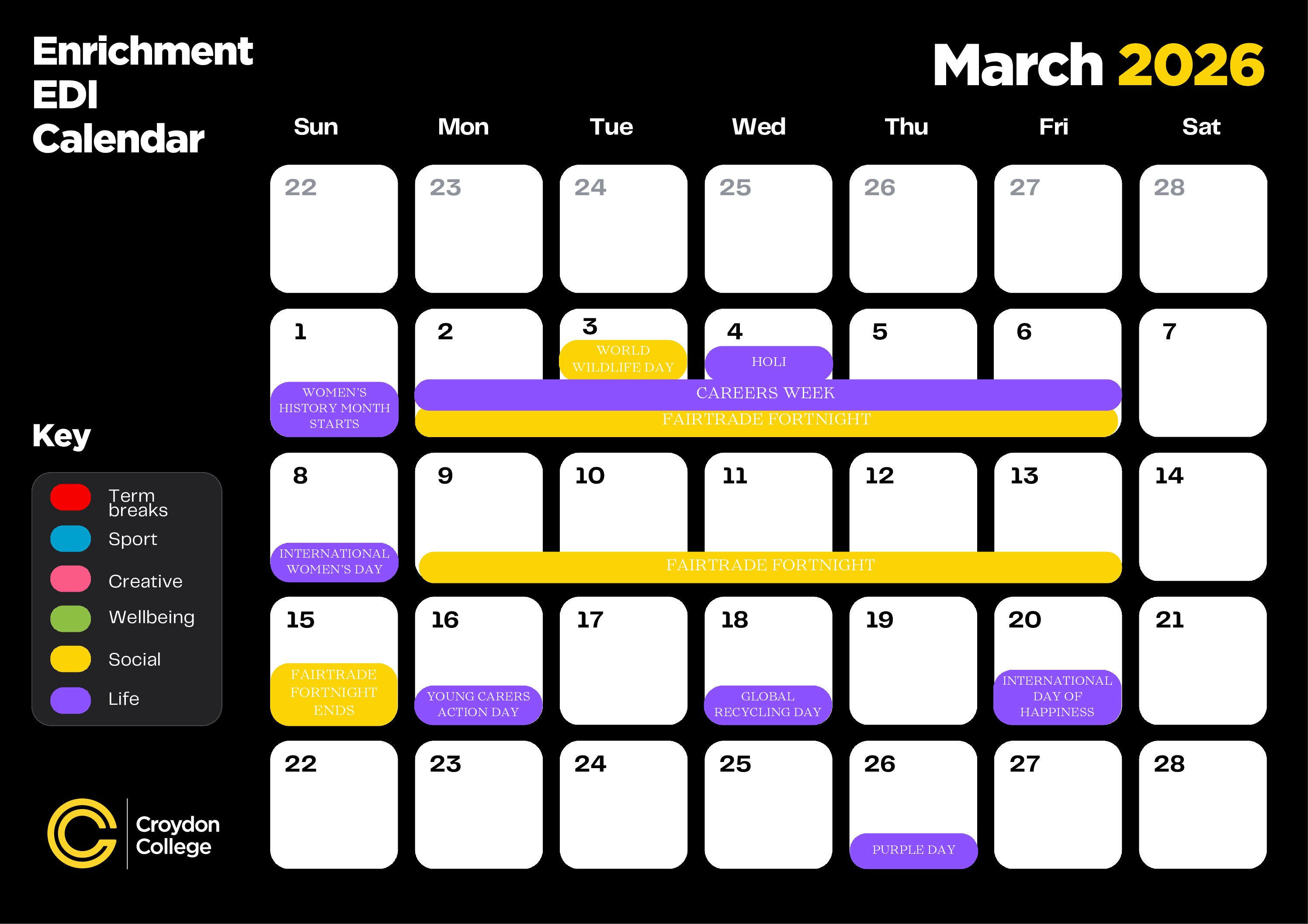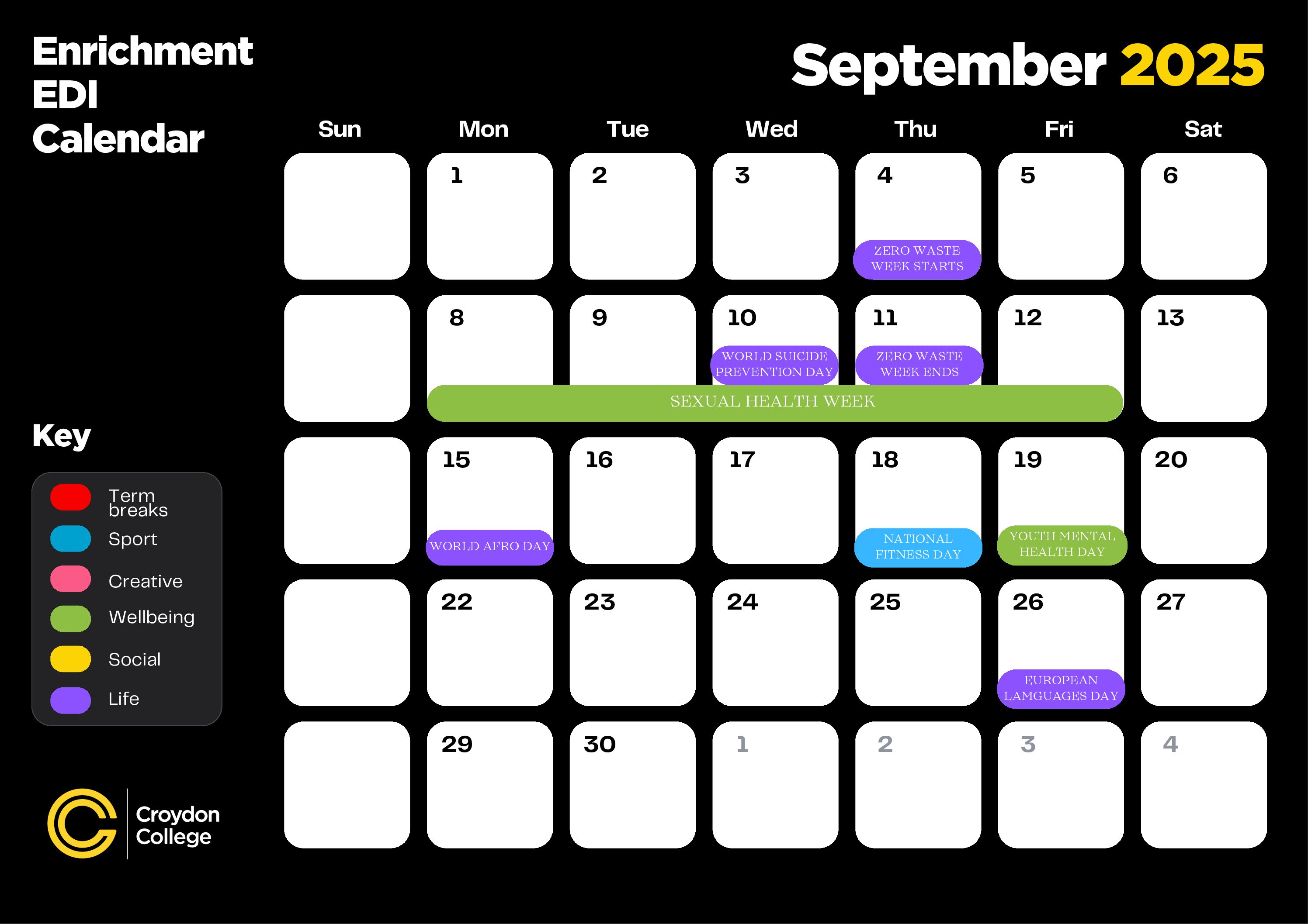 We believe that our diversity is one of our greatest strengths. We proudly welcome adults of all ages, abilities, religions, and sexual orientations, and are committed to providing everyone with access to high-quality education. As part of our ongoing journey toward greater equality, diversity, and inclusion (EDI), we’ve created this calendar to highlight important events and foster a culture where everyone feels included. We hope this resource proves valuable,